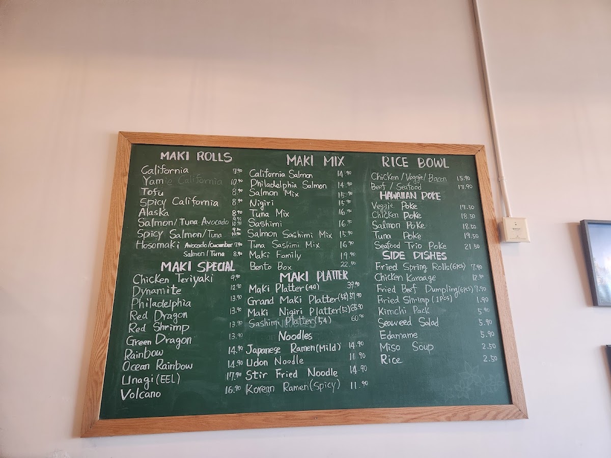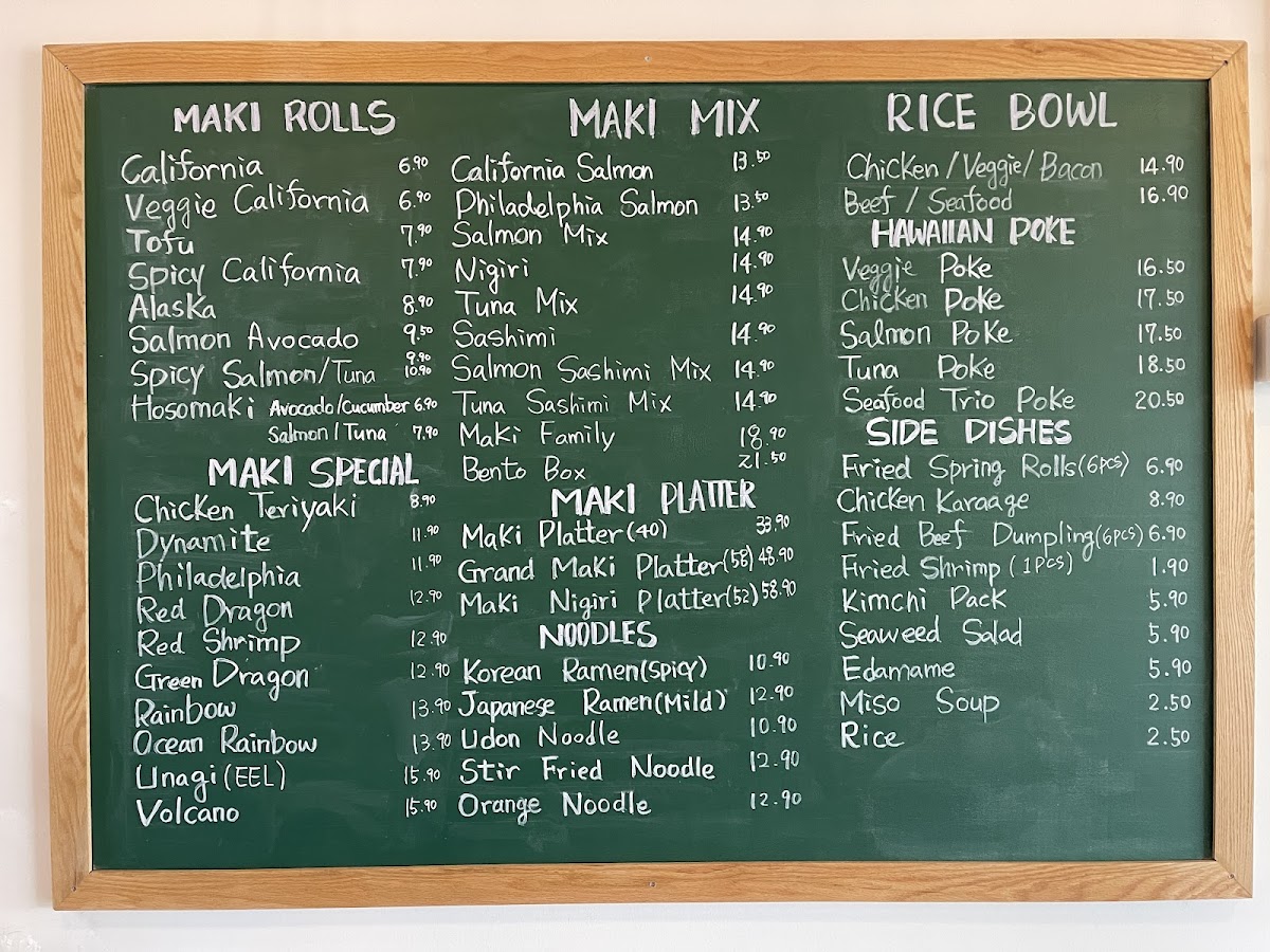 The menu at Maki Sushi & Noodle features a variety of Japanese dishes focusing primarily on sushi, ramen, rice bowls, and poke bowls. It is structured to offer a range of options suitable for casual dining, including quick orders or more substantial meals.